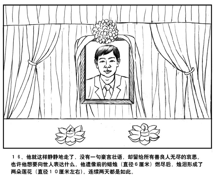 16、他就这样静静地走了,没有一句豪言壮语,却留给所有善良人无尽的哀思。也许他想要向世人表达什么,他遗像前的蜡烛(直径6厘米)燃尽后,蜡泪形成了两朵莲花(直径10厘米左右),连续两天都是如此。