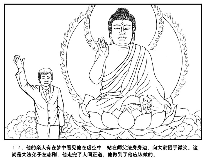 17、他的亲人有在梦中看见他在虚空中,站在师父法身身边,向大家招手微笑。这就是大法弟子左志刚,他走完了人间正道,他做到了他应该做的。