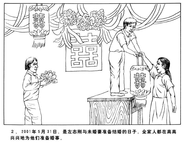 2、2001年5月31日,是左志刚与未婚妻准备结婚的日子,全家人都在高高兴兴地为他们准备婚事。