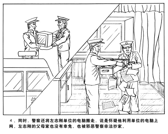 4、同时,警察还将左志刚单位的电脑搬走,说是怀疑他利用单位的电脑上网。左志刚的父母家也没有幸免,也被邪恶警察抄家。