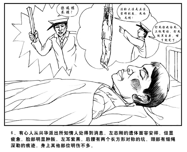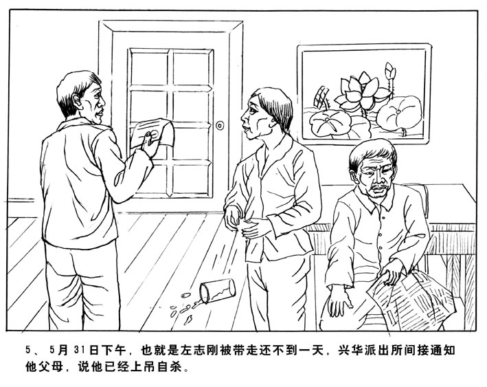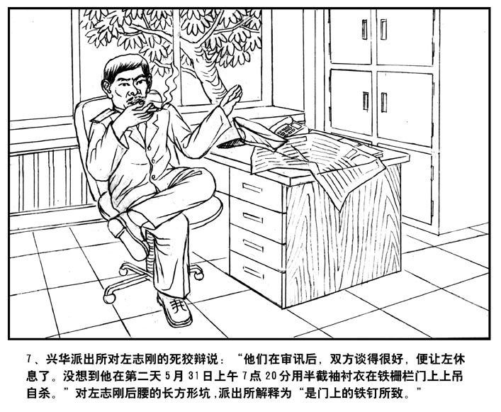 7、兴华派出所对左志刚的死狡辩说:“他们在审讯后,双方谈的很好,便让左休息了。没想到他在第二天5月31日上午7时20分用半截袖衬衣……”