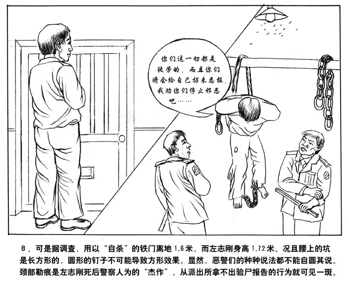 8、可是据调查,用以“自杀”的铁门离地1.6米,而左志刚身高1.72米。况且腰上的坑是长方形的,圆形的钉子不可能导致方形效果。显然,恶警们的种种说法都不能自圆其说。颈部的勒痕是左志刚死后警察人为的“杰作”,从派出所拿不出验尸报告就可见其一斑。