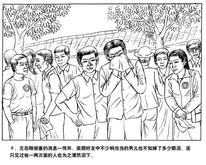 9、左志刚被害的消息一传开,亲朋好友中不少响当当的男儿也不知掉了多少眼泪,连只见过他一两次面的人也为之潸然泪下。
