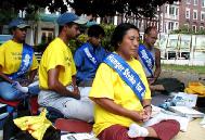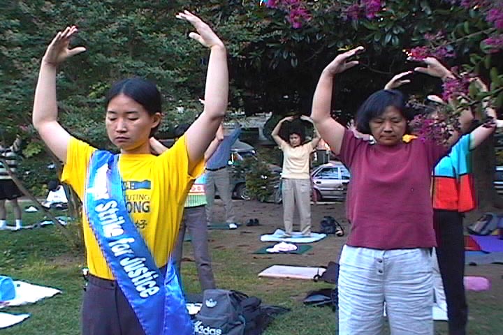 接着,大法弟子在预先准备好的展位前炼功洪法,征集签名,紧急救援大陆受迫害的法轮功学员。众多游人兴致勃勃地学炼了功法。看了展位前江泽民政府对法轮功学员残害的照片,人们纷纷对这种法西斯的行径进行谴责,并祝法轮功学员好运。