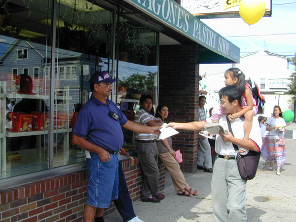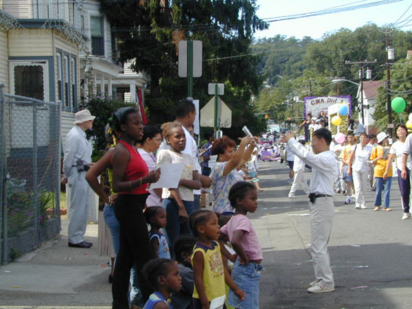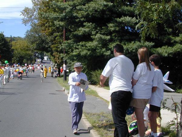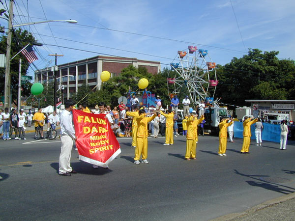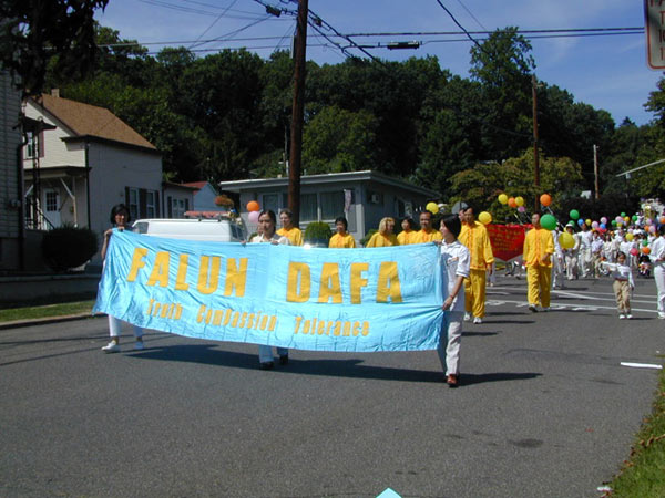 【明慧网2001年9月7日】9月2日,新泽西和纽约市的六十多名法轮功学员参加了新泽西州帕特生市的劳工节游行。法轮功的游行队伍受到当地居民热烈的欢迎,手拿法轮大法横幅和气球的学员们也不断地向街两旁的群众挥手致意,并不时地停下来表演功法,每次表演完时,沿路的群众都报以热烈的掌声。一些年轻人还模仿着学员的动作跟着练起功来,于是一位学员就热情地上前教她们。游行中学员们还一路散发介绍法轮功的报纸和小册子,使成千的当地居民闻得大法。