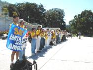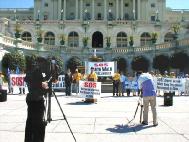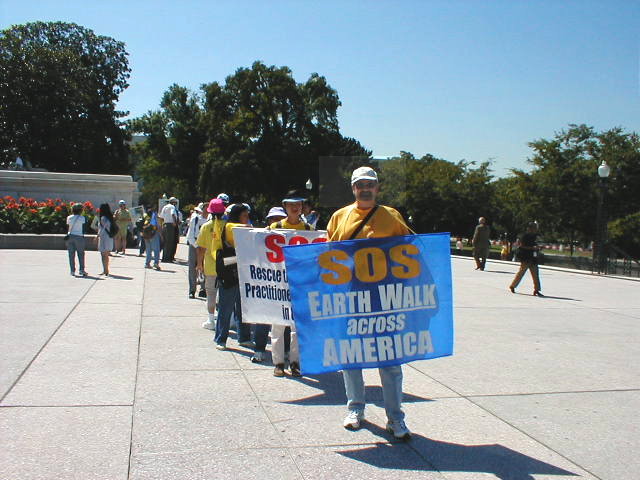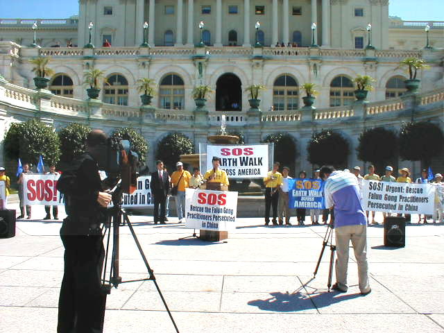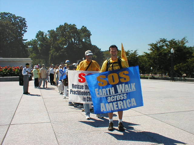 今晨的DC晴空万里,微风中带着些许秋意,学员们手举着自制的酷刑迫害图片小展板,以及“SOS-营救中国大陆受迫害的法轮功学员”,“SOS-步行穿越全美”等横幅,在国会山前一字排开,个个精神抖擞,一身正气。