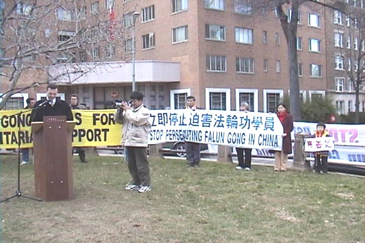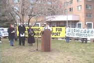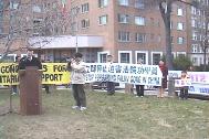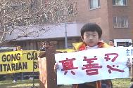 学员们手持写有“中国:停止迫害法轮功学员!”、“法轮功呼吁人道支持”等标语的大型横幅屹立在寒风中,立掌发正念,永远是那么庄严,那么祥和。另一侧,大使馆的门前依旧一派死气沉沉。想必杨大使的“心病”在新年伊始也给那些至今仍然嚣张、不知悔改的邪恶之徒以一个严厉的警告:谁迫害宇宙法理,谁迫害信仰真善忍的人们,谁就将得到他应有的恶报。