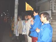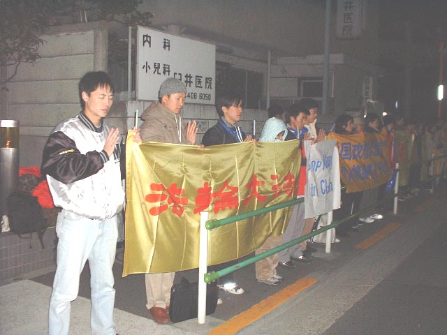 严冬的夜晚,虽是刺骨寒风,却丝毫动摇不了弟子们维护宇宙真理,捍卫大法尊严的心。大家庄严地举着“停止虐杀中国的法轮功学员”、“还法轮大法清白”、“法轮大法”、“释放日本弟子胡国平”等横幅,以纯善之心,齐发正念,坚决地清除迫害大法的一切邪恶,无所不包,无所遗漏。