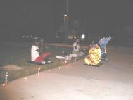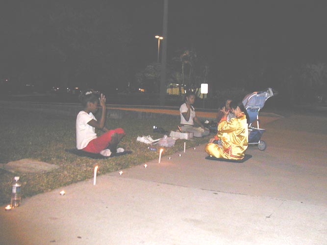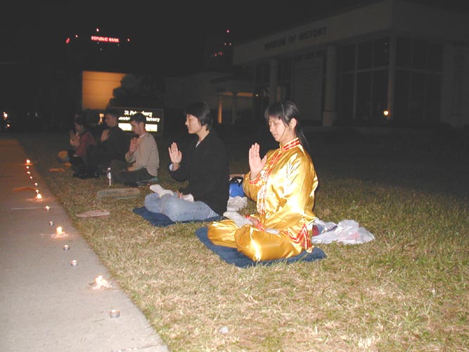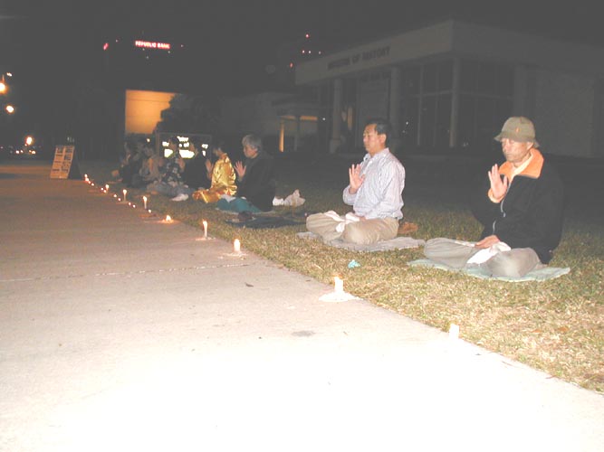 【明慧网2002年1月14日】2002年1月13日晚,佛州坦帕湾区学员在著名的景点--圣彼得堡栈桥,举行了烛光守夜,以唤起人们对目前中国江泽民政府对法轮功不断升级的迫害的关注。我们多次发正念清除破坏大法的一切邪恶,炼习五套功法,并向过往的行人讲述在中国对法轮功学员的残酷迫害的真相。行人们被我们安详、柔和的炼功所吸引,不能相信这样平和的功法竟会在中国被禁止和残酷迫害,甚至很多人为此被夺去生命。一些人当场要求学功,人们纷纷拿走我们的传单,并表达了对法轮功的坚定支持。