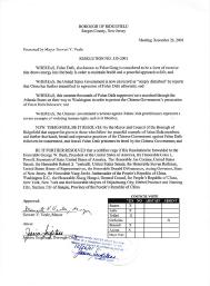 同时还决定:将本决议的公证副本送交美国总统乔治.布什(George W. Bush);美国国务卿考林.鲍威尔(Colin L. Powell);美国参议员约翰.科尔辛(John Corzine);美国参议员罗伯特.托瑞瑟里(Robert G. Torricelli);美国众议员唐纳德.培恩(Donald M. Payne);美国众议员罗伯特.门南代兹(Robert Menendez);新泽西州代理州长唐纳德.戴弗朗西斯科(Donald DiFrancesco);中国驻美大使杨洁褫;中国驻纽约总领事张宏喜;中国河北省石家庄市市长;中国江苏省南通市市长和徐州市市长。