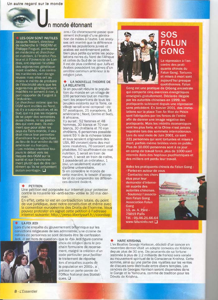 【明慧网2002年1月22日】法国《要点》(l'Essentiel)杂志是一份全国性刊物。《要点》第16号2002年1-2月刊发表了一篇题为“法轮功紧急救援”的文章。关于文章发表的前后,其中有一段动人的小故事。