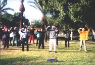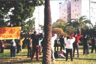 会前早晨八点时学员们在公园集体炼功。心得交流时八位学员和大家分享修炼体会和对大法的理解。每三位学员发言后大家集体发正念。