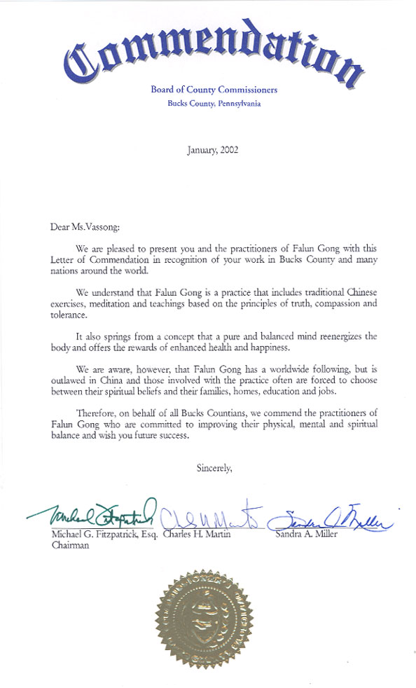 宾夕法尼州芭克斯郡行政长官给法轮功学员的褒奖信