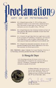 ,并敦促所有市民与我一起赞扬李洪志先生为向世界人民提倡“真、善、忍”原理而做出的不懈努力。