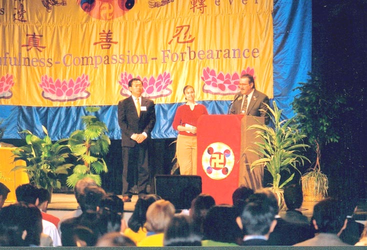 12月29日上午,佛州心得交流会正式开始。来自世界各地的600多位弟子参加了此盛会。在开幕词之后,詹姆斯.伯纳特先生上台亲自向法轮功颁发褒奖并发表了讲话,高度赞扬了法轮功所倡导的真善忍原则。他特别在讲话中用他年轻时如何通过忍让,以及让高年级学生也知道忍的道理而制止了在学校里盛行的对低年级学生的恶作剧恶习的亲身经历谈到了忍的重要性。他认为在现在这个不安定的社会环境下,这些原则是非常重要的。他说正是因为法轮功的真善忍原则而吸引了上亿的人修炼。在讲话中他指出是中国的江泽民独裁政府导致了对法轮功的迫害。他号召全市的人民都支持法轮功修炼者的努力。他并表示很遗憾这么重要的会议没能在圣彼德堡市召开并建议下一年的会议能在他所在的城市召开。