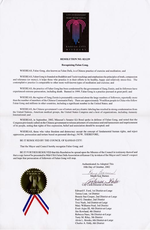 并且决定将本决议载入本议会会议记录以为证明,并将决议副本呈送美中法轮大法协会堪萨斯城分会,以此表达市长及市议会的敬意,并且希望这场对法轮功的迫害尽快停止。