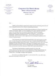最近,众议院通过了188号决议,谴责中国[江氏]政府对法轮功学员的迫害,并敦促我们的政府要求释放所有被非法关押的法轮功学员。我非常高兴能支持这一决议。