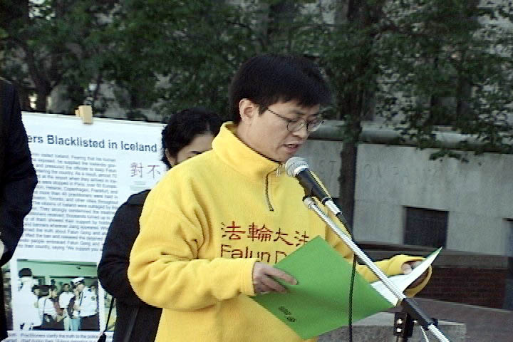 发布会上,哈佛大学癌症研究所的生物研究员何海鹰。讲述了他在国内的家人受迫害的经历。何海鹰的母亲黄女士,一位58岁的退休幼儿园教师,在1999年7月镇压一开始,就被抓进了监狱,非法关押了一年半。期间她被迫做苦工,遭受虐待。黄女士关押期满释放后,仍被国内公安不断地骚扰,24小时受人监视。何海鹰的妹妹何海燕女士是一位小学教师,因为写了一封为法轮功申诉的信,也被非法关押一年半,受尽折磨,包括长达两个月被关在不见天日的“小黑屋”。遭遇最惨的是何先生的弟弟何海鸥,他是一位医生,由于不放弃修炼,医院被迫解雇他。2000年10月的一天,何海鸥被公安绑架。他的太太与家人四处奔走打听他的消息,公安却说不知道。在这之后的21个月,没人知道何海鸥的生死。今年7月,公安局突然通知何太太他被判10年监禁,罪状是“不放弃法轮功”。何海鹰说,他本来美满的一家就这样被迫害得支离破碎。