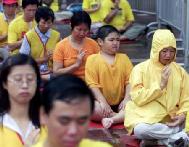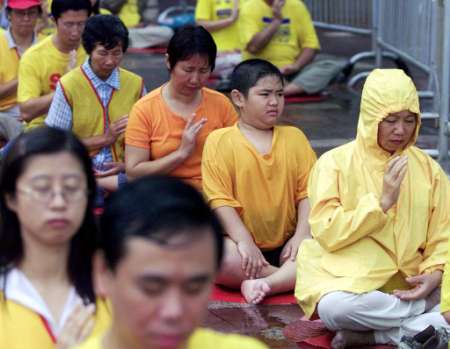 美联社引用法轮功发言人简鸿章的话说:“如果我们把中国法律定义引入香港,那将造成非常危险的局面。”此时有100多名法轮功学员在小雨中炼功。
