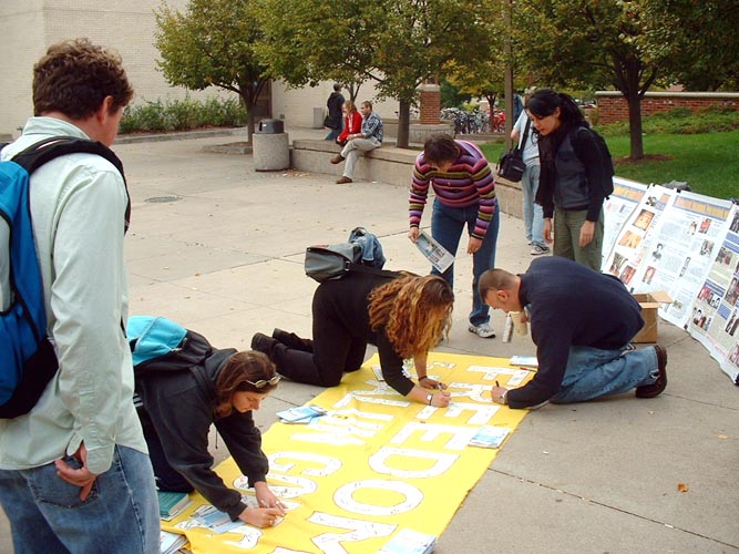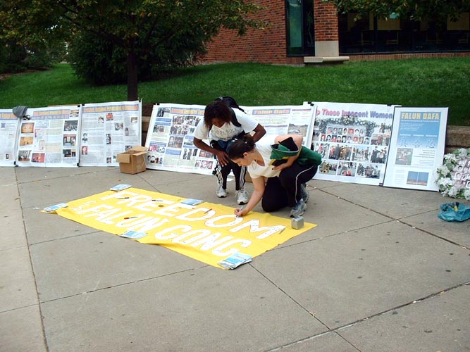 密苏里大学学生在呼吁释放法轮功学员的横幅上签名(图)