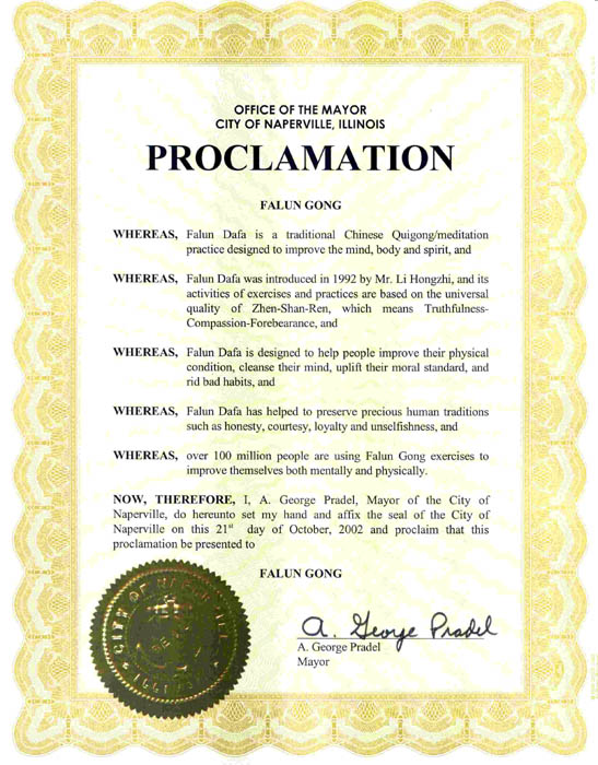 伊利诺州纳波维尔市市长嘉奖法轮功