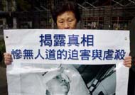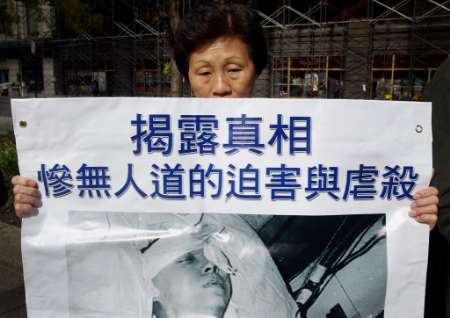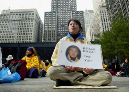 法轮功学员路易斯.秋举着牌子要求释放日本法轮功学员金子容子。