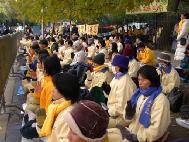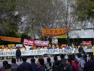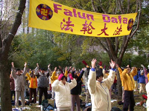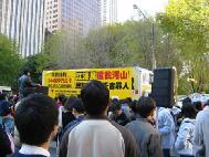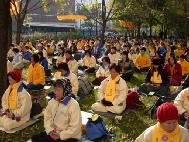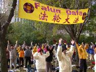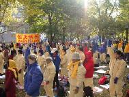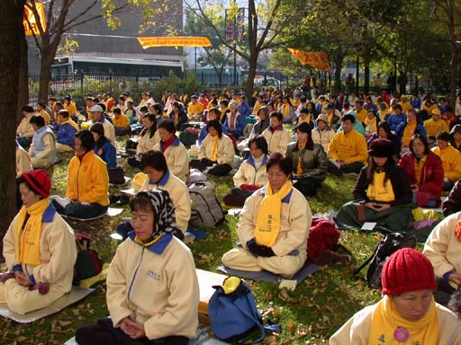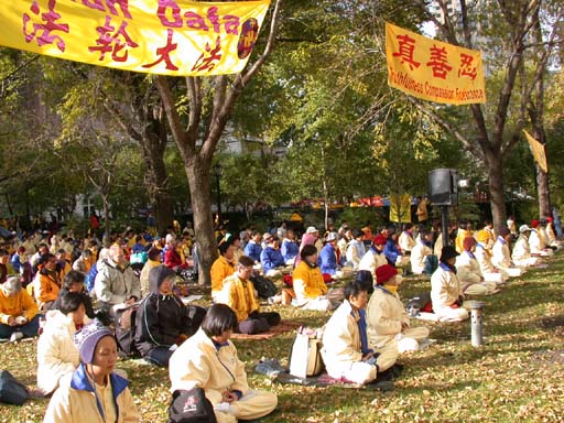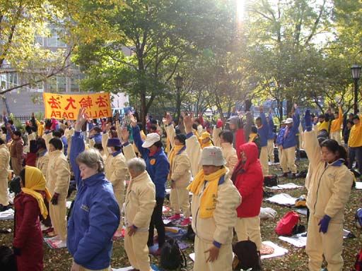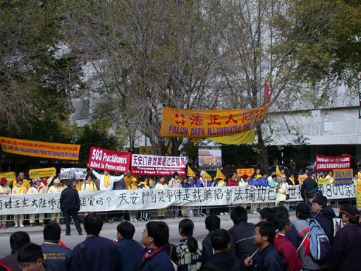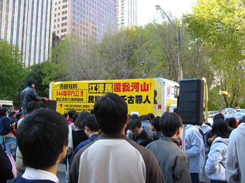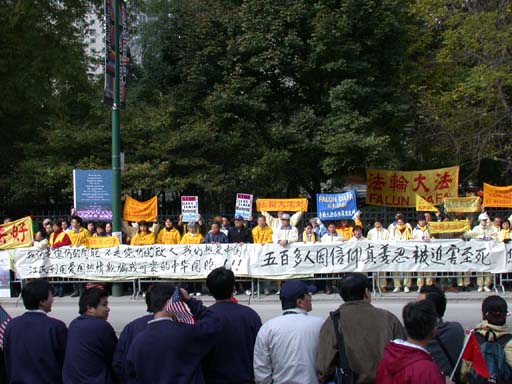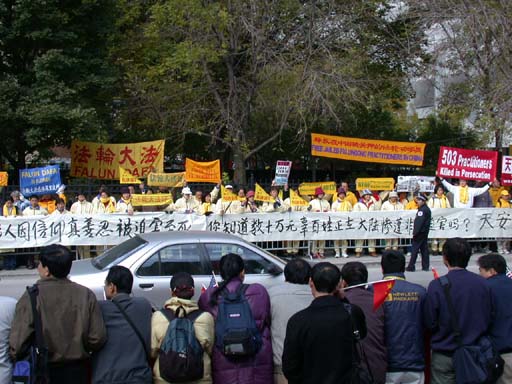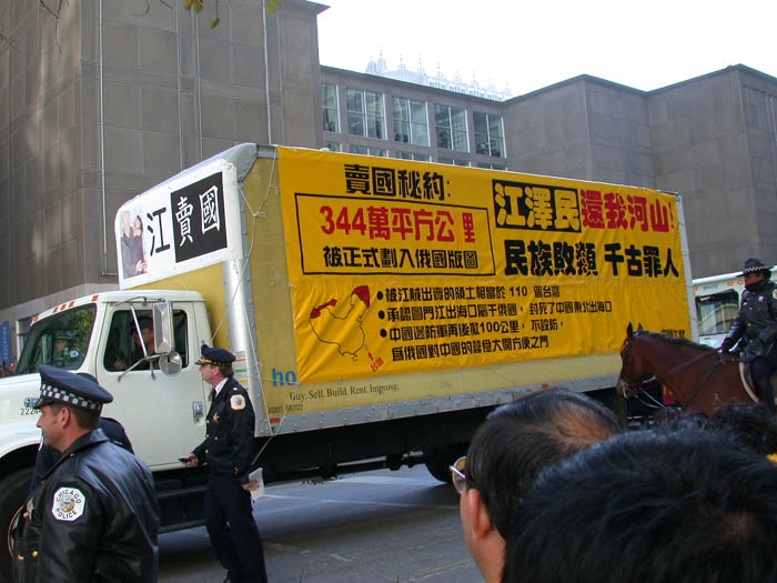 来自芝加哥的报导:10月22日上午11:25分,江XX到达芝加哥理兹(Ritz Carlton)酒店。为避免正门上千的和平抗议法轮大法学员和其它团体,江XX的坐车从酒店的停车场出入门驶入酒店。尽管中国领事馆安排了芝加哥地区各大学四五百人的欢迎队伍,也抵挡不过铺天盖地的“法轮大法好”,“停止镇压法轮功”的标语横幅,以及满眼的黄上衣。