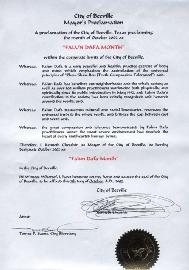 【明慧网2002年10月25日】德克萨斯州毕维尔市市长宣布2002年10月为毕维尔市的“法轮大法月”。