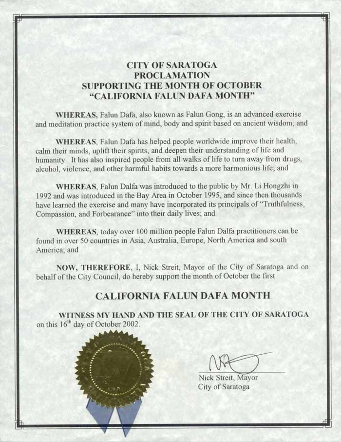 我于2002 年10月16日签署并以萨拉托加市的印章为证。