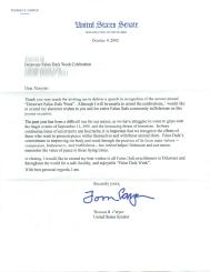 去年对于我们国家来说是困难的一年,我们艰难地应付2001年9月11日发生的悲剧及日益加剧的恐怖主义威胁。在这样持续性、莫测的、令人头痛的日子里,我们表彰那些在个人及周边人群里倡导和平而做出的努力,这很重要。法轮大法致力于通过对真善忍三个主要美德的实践来提高身心,在(目前)这样艰难的时候,这的确帮助了特拉华州和我们的国家记住和平的价值。
