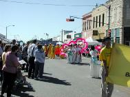 法轮功学员的游行队伍引人注目,金黄色的炼功服,印有“法轮大法好”的风车,还有队伍中精彩的舞蹈表演,博得了观众的阵阵掌声。观众们争先恐后地索要大法的材料,不时地有人说:“真美啊!”还有人说:“你们走过时,我们感到非常舒服,一片祥和。”