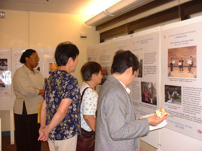 一位刚来美国不久的河南籍中年男子一直很专注地看着图片,他说法轮功在河南遭到的迫害他很清楚。来参观的美国人玛莎说:她一直在寻找一种古老的修行,今天看到法轮功很和谐,她很感兴趣。另一美国人尤金说:他相信身心是统一的,一直想提高自己的心灵,使生活得更好,很想炼法轮功。