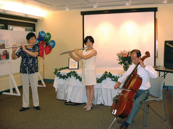 开幕式上,原中央乐团国家一级演员陈汝棠夫妇与女儿陈缨为来宾演奏了大法音乐“普度”,和他们为歌颂大法弟子在残酷迫害下冒着生死坚持上访而作的“莲花颂”。法轮功学员还为来宾表演了功法。