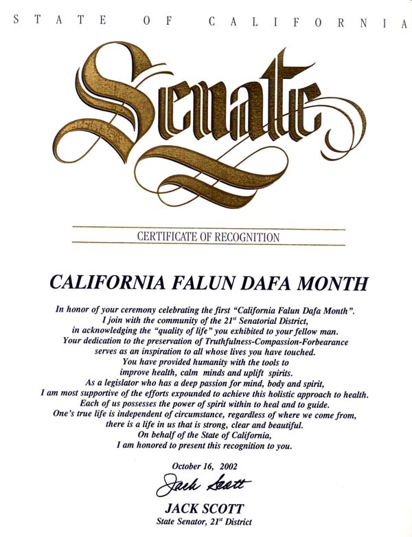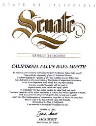加州参议院议员斯考特先生祝贺首届“加州法轮大法月”