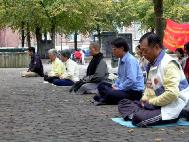 在海牙国会门前有两位过路人和我们同坐在阿姆斯特丹炼功,洪法,讲真相。