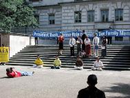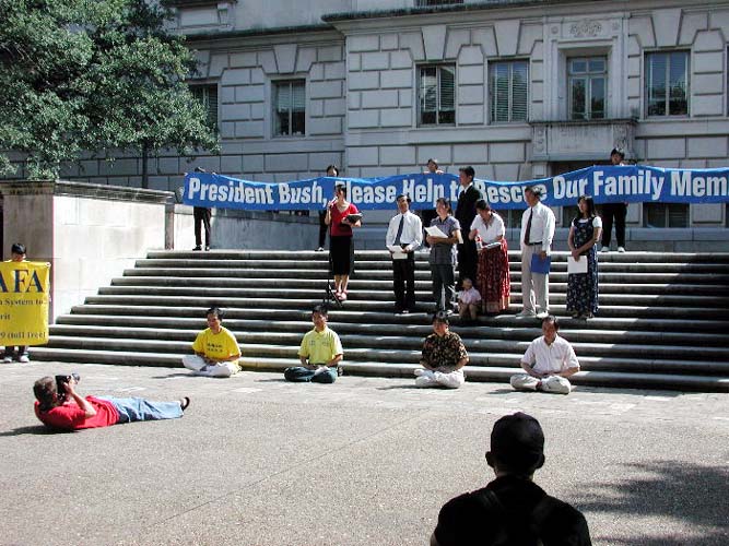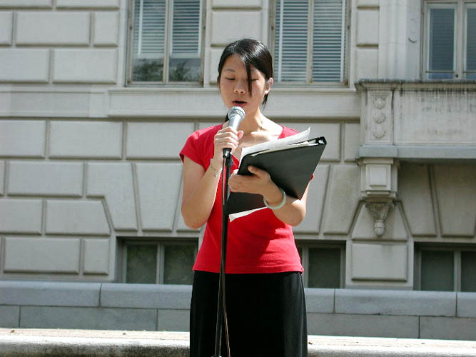 从澳大利亚赶来的戴志珍女士,牵着她两岁的女儿走上台,讲述了她一家的悲惨遭遇。她的丈夫──孩子的父亲因炼法轮功,在中国被迫害致死;她丈夫的姐姐因炼法轮功仍被非法关押在狱中;她的公公因不堪忍受儿女们遭受这样的迫害而悴然离世。现在戴志珍忍着自己的悲痛,坚强地站起来,告诉人们在中国发生的残酷迫害法轮功学员的事实,揭露江XX政治流氓集团的谎言和恶行,请善良的人们共同制止这场对修炼真、善、忍的法轮功学员的迫害。她以平静的口吻讲述着……最后大学生们报以热烈的掌声,表达着他们对法轮功学员的钦佩。