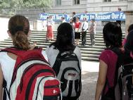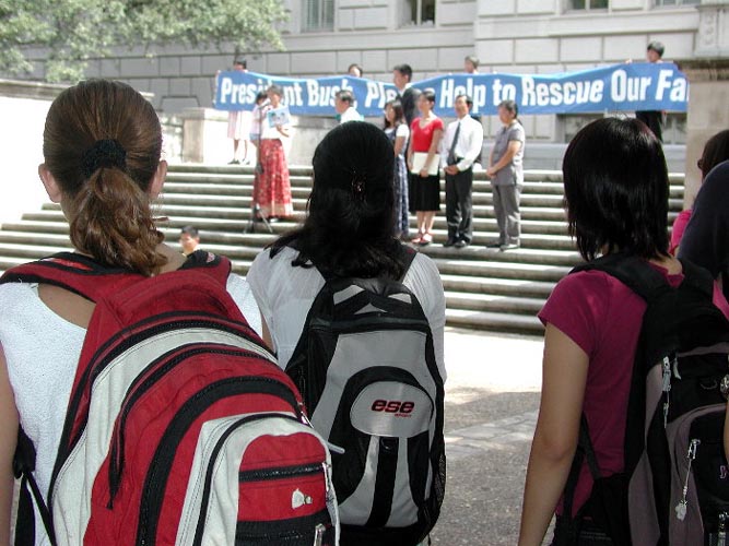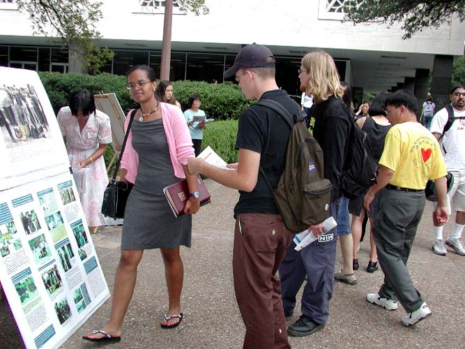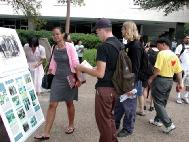 来来往往的学生很多,法轮功学员们的讲述吸引他们的目光,并深深地打动了在场的人。学员们还在路的两旁摆放了大法真相展板,许多人都驻足认真地阅读,表示对江XX政治流氓集团恶行的愤慨,想要帮助法轮功学员,有几百人在要求布什总统制止这场迫害的名信片上签了名,希望早日结束这场迫害。