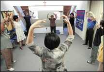 随着录音机里传来柔和的音乐,以及音乐里伴随着一个沉静的,讲中文的声音,法轮功学员们徐徐地将手臂上下移动。