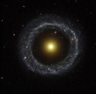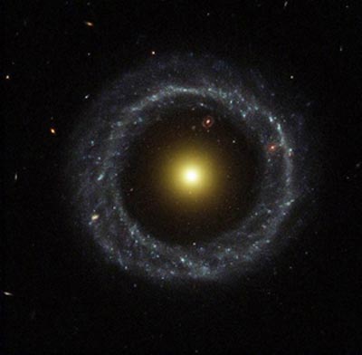 广州日报大洋网──这张是美国哈勃空间望远镜捕捉到的一银河系的环形的星群照片,该照片比这个银河系的任何现有的照片都清晰。整个星系大约120,000光年宽,比我们的银河星系稍微大。这光环主要由蓝色的小恒星组成,与黄色的核心形成鲜明对比。