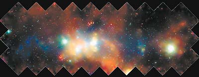 中国青年报2002年01月18日──近日,美国马萨诸塞州立大学的两位教授在美国华盛顿举行的天文学联合会年会上展示了他们利用Chandra X光望远镜拍摄的有关银河系中央景观的照片,《自然》杂志也在最新一期中刊载了30多张照片。天文学界人士纷纷表示,这是迄今为止拍到的效果最清晰的银河系中央景观照片,这张照片显示了数百颗白矮星、中子星以及太空黑洞,这些星体全部被厚重的气体包围着。