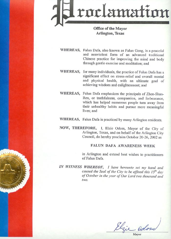 鉴此,我,艾泽.欧敦(Elzie Odom),德克萨斯州阿灵顿市(Arlington)市长,代表市议会宣布2002年10月20日-26日为阿灵顿市