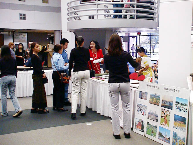 法轮功学员在展桌上展示了法轮功学员集体炼功图片,法轮功学员手工制作的色彩绚丽的莲花和中国乐器等。作为展示中国文化的一部分,法轮功学员表演了女声独唱,先唱了两首英文歌曲,然后用中文演唱了“法轮大法好”等歌曲。精彩的演唱受到人们的欢迎。