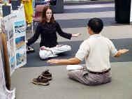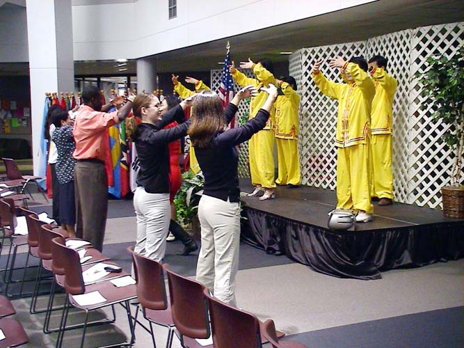 接着法轮功学员上台表演了五套功法,给学院的师生员工们留下了深刻的印象,有几位当场就跟法轮功学员学起来了。台上是法轮功学员在表演功法,台下是学院的师生在学功。有位叫苏珊(Susan)的女学生对法轮功特别感兴趣,围着法轮功展桌转悠了好长时间,问这问那,学功也学得非常认真,而且她当时就能双盘并准确地做完第五套功法。最后她和其它几位学生记下当地学员的电话,表示要继续学功。