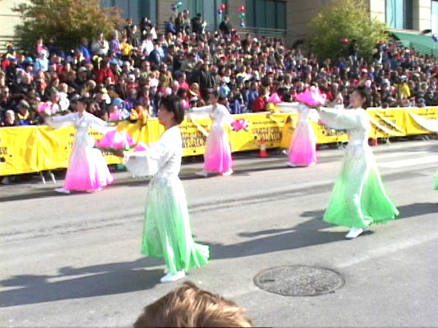 经过学员的精心构思,法轮大法队伍引人瞩目。最前面是中文字“真、善、忍”圆型标帜,和英文“法轮大法──真、善、忍”的大横幅旗帜。后面是扇子舞蹈队,表演中国民族风格的舞蹈,鲜红的圆圈旋转向前;紧接着为炼功队,大法弟子身着黄色炼功服,在炼功音乐中展示法轮功功法,路边观众不断赞叹;随后是莲花舞蹈,莲花花篮烘托着中英文“真、善、忍”。朵朵莲花波浪式向前,优美的舞蹈表演使观众雀跃欢呼;再后面是中英文的“法轮大法”的横幅,以及身着黄T恤、手持彩色汽球的弟子。“法轮大法好”的歌曲一路飘扬。大法弟子以良好的风貌和精彩的艺术表演将大法的美好展现给了数万在场的观众和数十万以上的电视荧屏前的休斯敦市民们。