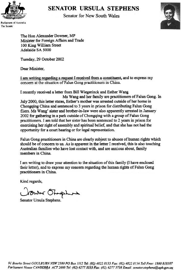 显然,中国的法轮功学员的人权正受到摧残,这是我们应该关注的。我所收到的这封信显然说明这也已经影响到了澳大利亚人的家庭,他们和在中国的家人失去了联系,并急切地希望了解他们的情况。