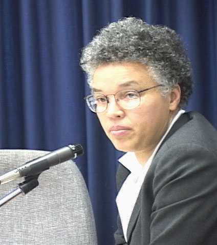 | 10月31日市议会人际关系委员会主席Billy Ocasio主持举行听证会 | 法轮功学员谭永洁在听证会上做证 | 法轮功决议案发起人Toni Preckwinkle在听证会上 |