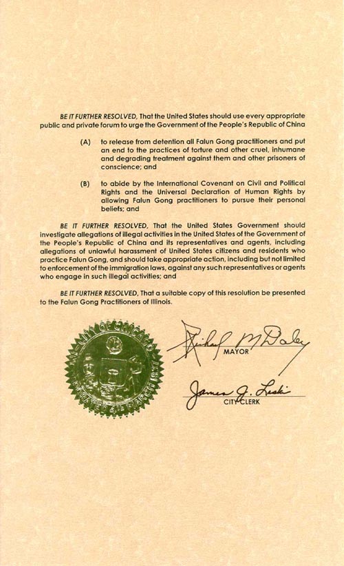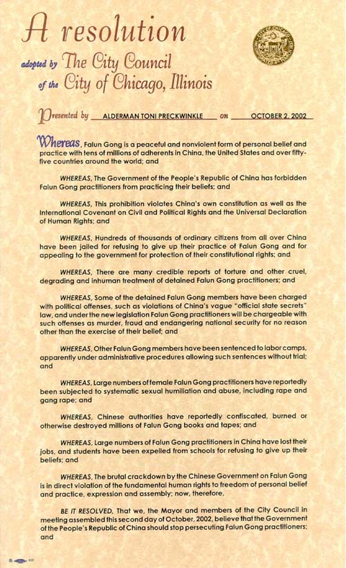 鉴此,[芝加哥]市长和市议会成员在2002年10月2日的集会中相信,中华人民共和国政府应停止迫害法轮功修炼者;并且