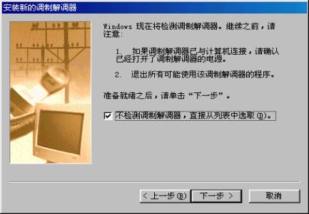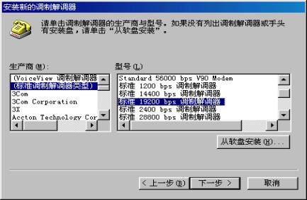 控制面板调制解调器添加Modem选择"不检测调制解调器,直接从列表中选取"选择"标准19200bps调制解调器",如下图所示选择适用的端口(如COM1)进行安装完成