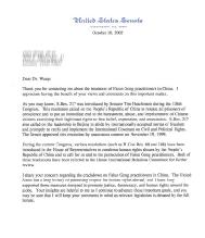 我理解你对法轮功修炼者在中国遭受镇压的忧虑。美国长久以来一直提倡世界各国尊重人权,我自己也一直支持在全球范围内为提倡公正、民主和人权所采取的措施。在我继续为实现这些重要目标而努力的时候,你的洞见使我获益。请你放心,当相关的议案送到参议院进行全体讨论时,我会记得你的评论。
