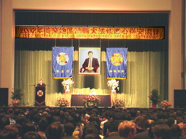 【明慧网二零零二年十二月一日】2002年11月30日,在美国宾夕法尼亚州费城临近唐人街的宾州会议中心(Pennsylvania Convention Center)举行了“2002年美东地区法轮大法修炼心得交流会”。美国东部的大法弟子,和来自美国其它地区及世界各地的两千名法轮功学员参加了这次盛会。下午两点多,师父亲临会场讲法。在全场学员的热烈掌声中,师父以两句脍炙人口的唐诗“两岸猿声啼不住,轻舟已过万重山”为开场白,告诉众弟子“迫害三年多了,邪恶已经使绝了招,大法弟子已经考验成熟了”,并给大法弟子们讲法约40分钟。